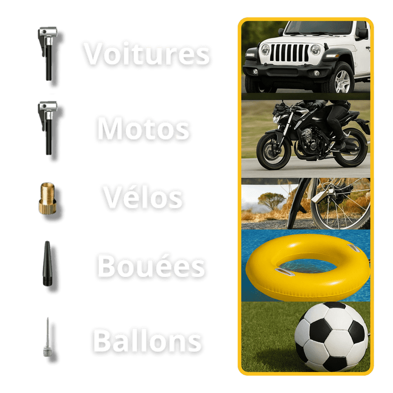 Grâce à ses embouts interchangeables, ce compresseur s’adapte à une large variété d’usages :